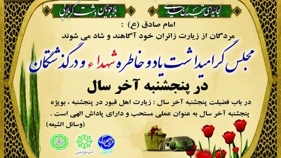 حجت الله بابادی در گفتگو با پایگاه خبری مدیریت شهری فردیس، با اشاره به فرا رسیدن آخرین پنجشنبه سال و سنت پسندیده زیارت اهل قبور در این روز، اظهار کرد: مراسم گرامیداشت یاد و خاطره شهدا و درگذشتگان به صورت همزمان در دو آرامستان رزکان و سرحدآباد برگزار می شود.