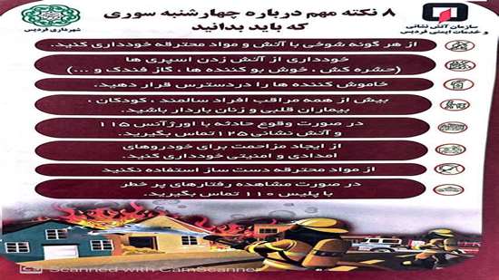 رئیس سازمان آتش نشانی و خدمات ایمنی شهرداری فردیس به شهروندان هشدار داد: از آتش زدن لاستیک، هیزم، کارتن خالی و امثال آن چه در واحدهای مسکونی و چه در معابر ، کوچه و خیابان و از پرتاب مواد آتش زا مانند فشفشه و موشک بر روی درخت ها، بام و بالکن منازل که از عوامل عمده بروز آتش سوزی است پرهیز و از ریختن مواد سریع الاشتعال مانند نفت، بنزین و غیره بر روی مواد آتش گیر خودداری کنید. همچنین از قرار دادن  ظروف تحت فشار از جمله کپسول، اسپری، حشره کش ها و غیره بر روی آتش خودداری کنید.